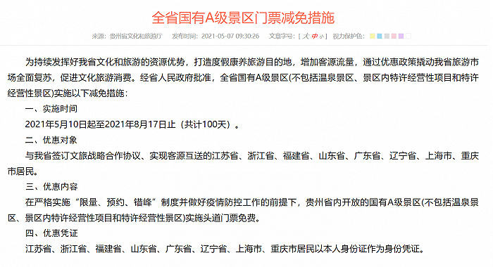 据贵州省文旅厅网站5月7日消息,经省人民政府批准,贵州省内国有A级景区(不包括温泉景区、景区内特许经营性项目和特许经营性景区)对江苏省、浙江省、福建省、山东省、广东省、辽宁省、上海市、重庆市等8省市居民,以本人身份证作为身份凭证,实施头道门票免费。优惠政策时间为5月10日至8月17日,共计100天。
