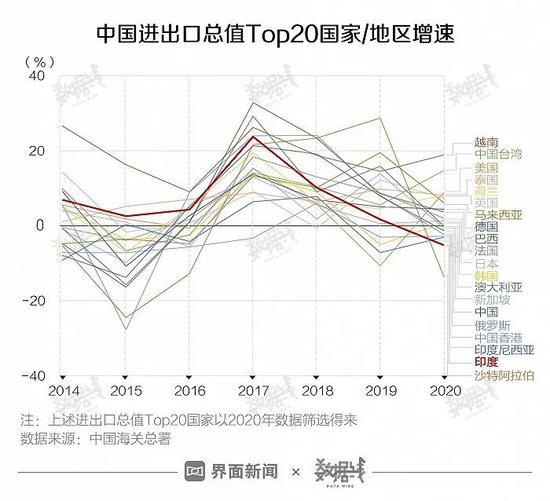 从增势上来看,2017年以来中国对印度进出口总值增长逐年趋缓。截至2020年,中国对印度进出口总值同比下降5.3%,较2017年增速减少了约28.9个百分点。