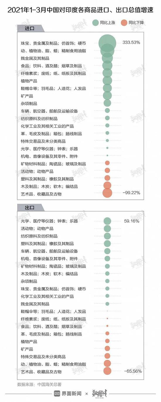 从进出口数据来看,印度此轮疫情爆发前的3个月,中国对印度进出口商品总值为1799.5624亿元,较2020年同期上涨33%。其中,对珠宝、贵金属及制品、仿首饰及硬币类进口总值涨超330%,对动、植物油、脂、蜡、精制食用油脂类进口总值涨超200%。