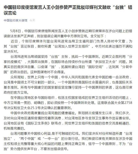 原标题:印媒刊文鼓吹“台独”错误言论 中国驻印度使馆发言人严正批驳