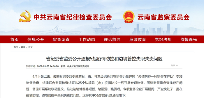 云南省纪委省监委公开通报5起疫情防控和边境管控失职失责问题