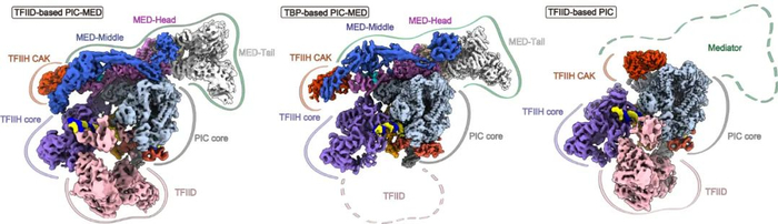 图1: 本项研究基于TFIID的完整PIC-Mediator复合物(左),中间为何源组近期发表的基于TBP的PIC-Mediator,右侧为徐彦辉组今年4月份发表的基于TFIID的PIC。(参考文献:Chen, X., Qi, Y., Wu, Z., Wang, X., Li, J., Zhao, D., Hou, H., Li, Y., Yu, Z., Liu, W.,Wang, M., Ren, Y., Li, Z., Yang, H., and Xu, Y.* (2021). Structural insights into preinitiation complex assembly on core promoters. Science. 372(6541):eaba8490.)