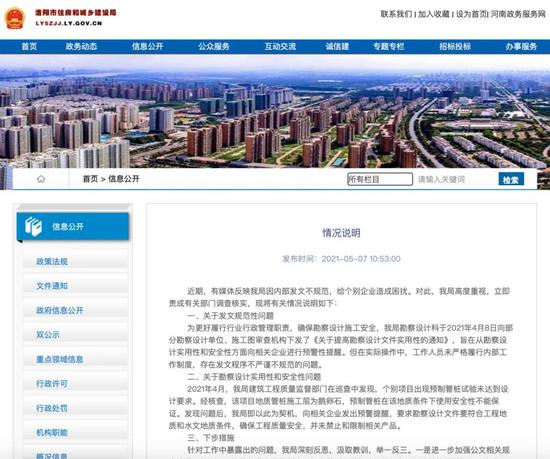 报道刊发后引发外界广泛关注。5月7日,洛阳市住建局迅速行动,在其官网发布了“情况说明”。