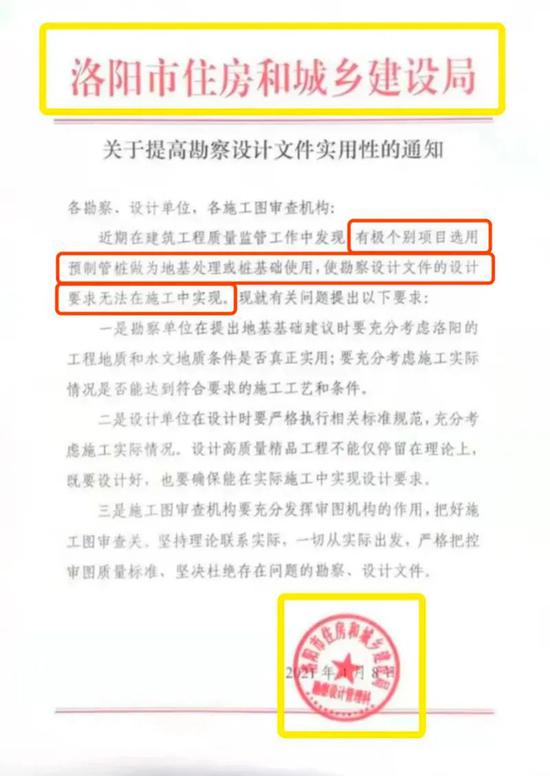首先,洛阳市住建局坦承存在问题:“在实际操作中,工作人员未严格履行内部工作制度,存在发文程序不严谨不规范的问题。”洛阳市住建局解释称,确向相关企业发出预警提醒,要求勘察设计文件要符合工程地质和水文地质条件,确保工程质量安全,但“并未禁止和限制预制管桩相关产品”。