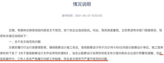 在“情况说明”中,洛阳市住建局坦承:该局勘察设计(管理)科于2021年4月8日向部分勘察设计单位、施工图审查机构下发了前述通知,“但在实际操作中,工作人员未严格履行内部工作制度,存在发文程序不严谨不规范的问题。”