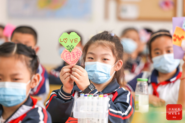 5月7日,新疆维吾尔自治区库车市阳明小学开展“感恩母亲”为主题的活动,全校800余名小学生在美术老师的指导下,用彩纸折叠心形祝福卡,并用彩笔描绘对妈妈的感恩之情。图为二年级学生展示自己制作的心形祝福卡。(新疆维吾尔自治区库车市纪委监委供 袁欢欢 摄)