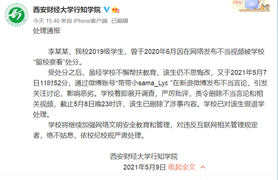 受处分之后,虽经学校不懈帮扶教育,该生仍不思悔改,又于2021年5月7日11时52分,通过微博账号“带带小sama_Lyc ”在新浪微博发布不当言论,引发关注讨论,影响恶劣。学校着即展开调查,严厉批评,责令删除不当言论和相关视频,截至5月8日晚23时许,该生已删除了涉事内容。学校已对该生做退学处理。