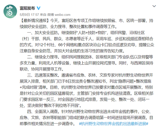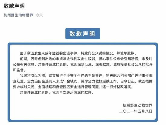 针对三只金钱豹出逃事件,杭州野生动物世界也在其官方微信里,发布致歉声明。