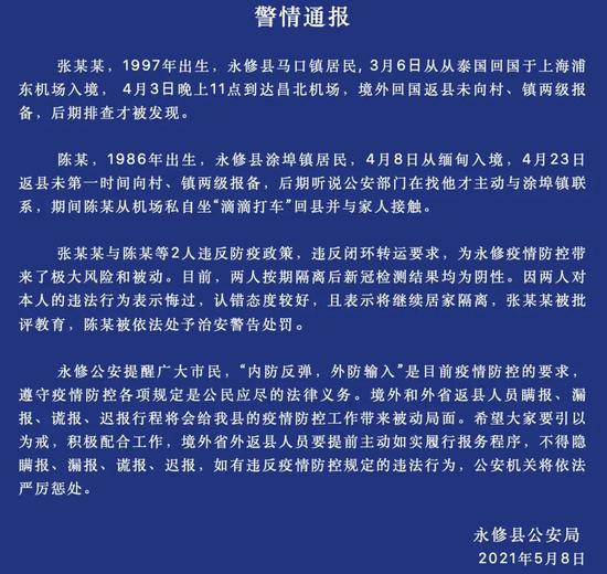 5月8日,江西省九江市永修县公安局通过官方微信通报称,两名居民因从国外返乡后未向村、镇两级报备,被当地警方查处。