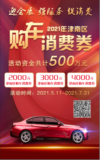 为贯彻市、区各级政府关于促进汽车消费指示,满足人民群众消费需求,以良好营商环境,迎接2021年首次国家级大展,津南区政府出资500万元面向全市发放购车消费券,用真金白银鼓励广大市民来津南区购车消费。该方案将于5月11日正式实施。