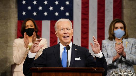 4月28日,美国总统拜登(中)在国会发表演讲