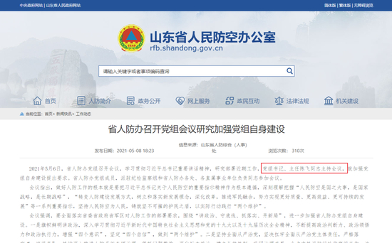 上述官方消息显示,陈飞已任山东省人民防空办公室党组书记、主任。
