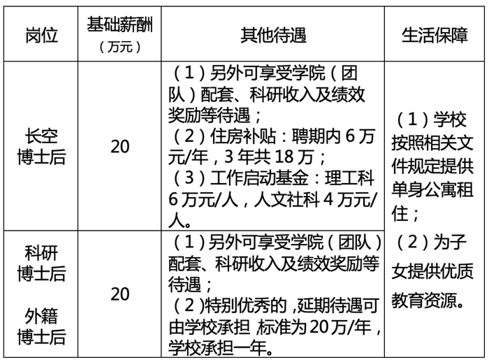 1.学校准聘长聘教师岗位优先从期满出站的长空博士后、晋升高级专业技术职务的科研博士后中选拔;学校专职科研岗位优先从博士后中选拔。