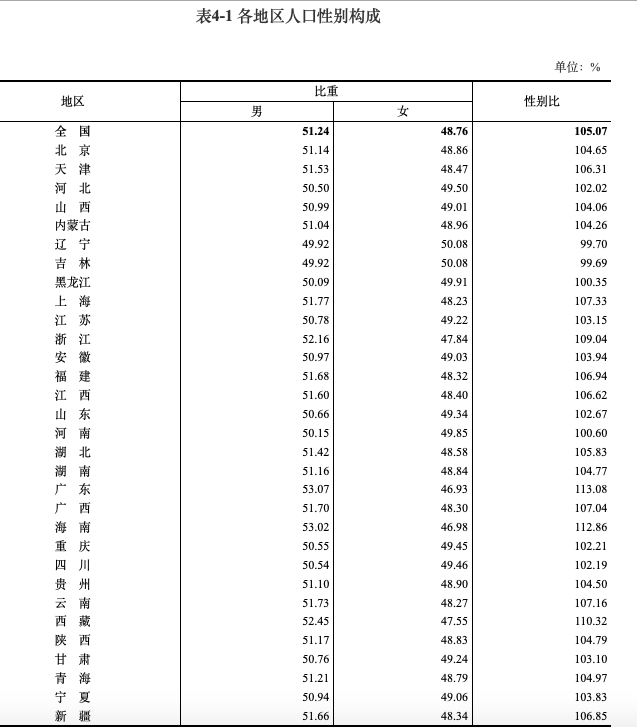 5月11日,国家统计局、国务院第七次全国人口普查领导小组办公室发布数据显示,全国人口共141178万人(14.1178亿人),其中,男性人口为723339956人,占51.24%;女性人口为688438768人,占48.76%,全国总人口性别比为105.07,其中广东最高,为113.08。