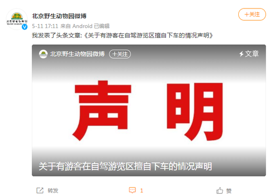 北京野生动物园:关于有游客在自驾游览区擅自下车的情况声明