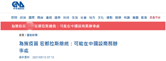 [环球网报道 记者赵友平]台湾“中央社”消息,台湾中美洲“友邦”洪都拉斯总统埃尔南德斯11日表示,为了取得新冠疫苗,洪都拉斯可能在中国设立商务办事处。