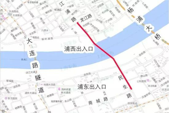 江浦路越江隧道新建工程北起杨浦区江浦路、龙江路路口,向南下穿福宁路、杨树浦路、黄浦江、滨江路、昌邑路、浦东大道、栖山路后出地面,至浦东新区民生路、商城路路口止。