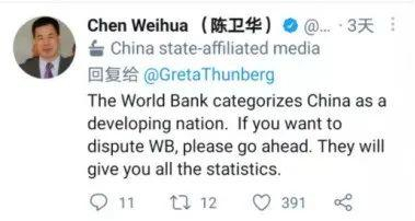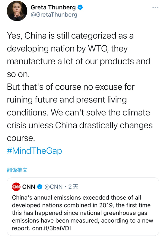 该报告一经外媒报道,就引来了瑞典“环保少女”格雷塔·通贝里(Greta Thunberg)的注意。她在社交媒体上就中国碳排放等问题指责中国,质疑是否应当将中国视为发展中国家,并称“除非中国彻底改变路线,否则我们无法解决气候危机”。
