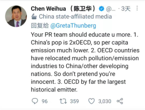 “你的公关团队应该多教给你一点常识。第一,中国人口是OECD(经济合作与发展组织)所有成员国人口加起来的两倍,所以中国人均排放量要低得多。第二, OECD国家把大量排放污染的工业放在中国和其他发展中国家,别假装你们是无辜的。第三,OECD国家在历史上就是最大的排放者。”