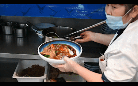 看食堂阿姨们端出热气腾腾的刷酱饼
