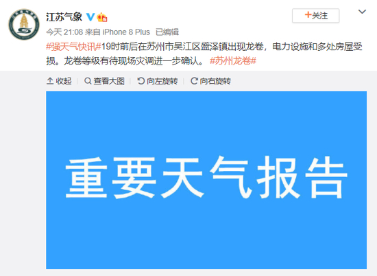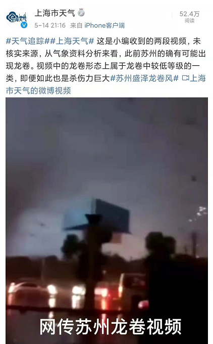 5月14日晚间江苏省气象台发布消息当日19时前后在苏州市吴江区盛泽镇出现龙卷风电力设施和多处房屋受损龙卷等级有待现场灾调进一步确认