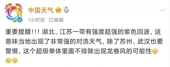 另据中国天气网消息不仅是江苏湖北一带也有强度超强的紫色回波这意味当地出现了非常强的对流天气除了苏州,武汉也要警惕这个超级单体里面不排除出现龙卷风的可能性