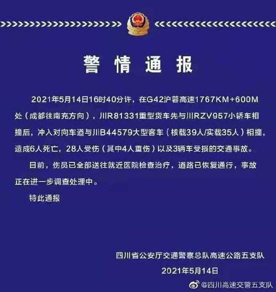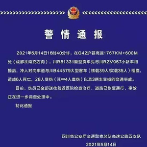5月14日16时41分,沪蓉高速南充至成都方向K1767+550米处,发生一起客车与货车相撞的交通事故。南充市应急管理局通报称,车祸造成6人死亡,28人受伤,3车受损。