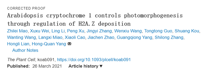 上海师范大学杨洪全教授围绕植物“眼睛”隐花素CRY的功能和作用机理展开了20多年的研究,做出了一系列具有重要影响的研究成果,相关论文发表在Cell、Plant Cell、PNAS和Genes & Development等权威学术刊物上。2021年3月该团队在Plant Cell上发表了有关隐花素调控植物调控组蛋白变体H2A.Z替换促进光形态建成的研究论文。