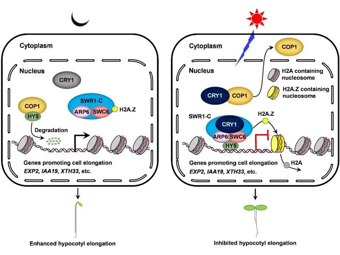 该团队研究工作表明,CRY1一方面可能通过与SWC6和ARP6互作,来增强SWR1复合物活性来促进H2A.Z的替换;另一方面还可能通过抑制COP1的活性来促进HY5蛋白的积累,通过与SWC6/ARP6的互作来增加对SWR1复合物的招募量来促进H2A.Z的替换。上述两层调控双管齐下,CRY1可以高效介导蓝光信号对H2A.Z在HY5靶基因上占位的促进,抑制下胚轴伸长有关的基因表达,从而促进光形态建成。