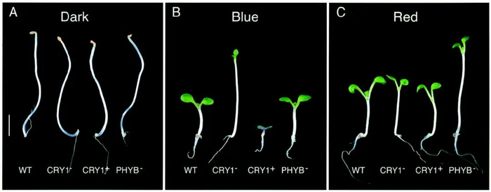 模式植物拟南芥也是如此,种子在黑暗下萌发会表现出黄化苗的表型,例如长下胚轴和闭合子叶、叶绿素不能合成;而在光下萌发则会表现出正常子叶张开的绿色小苗。假如植物失去了隐花素这个“眼睛”,那么植物在蓝光下就会变成“瞎子”,表现出类似黑暗生长的长下胚轴和闭合子叶的表型。这会导致严重的后果,即植物的子叶和叶片不能扩展,叶绿素合成受阻,这样的植物不能进行正常的光合作用,从而使植物不能正常生长发育。