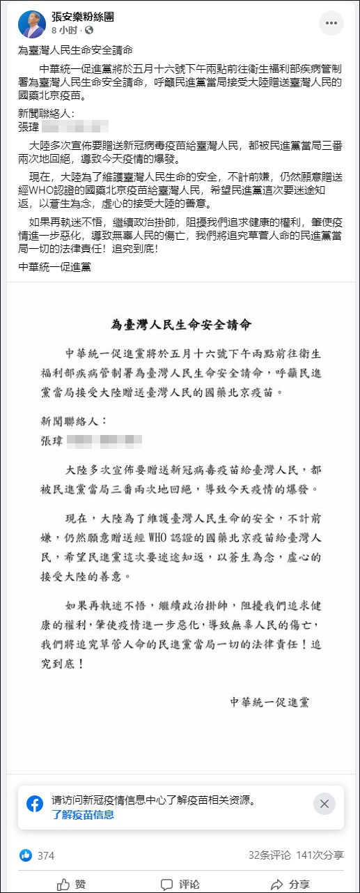 5月16日凌晨1时许,中华统一促进党(下称“统促党”)在社交媒体Facebook账号“张安乐粉丝团”(观察者注:张安乐,台湾地区政治人物,别名“白狼”,现任中华统一促进党总裁,主张两岸统一、一国两制等)上发文,称16日下午2点将前往台湾“卫生福利部疾病管制署”,“为台湾人民生命安全请命”,并呼吁民进党当局接受大陆赠送台湾人民的国药北京疫苗。