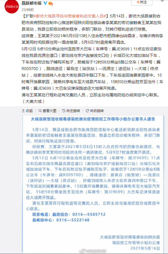 原标题:扩散廊坊大城县寻找与密接者轨迹交集人员