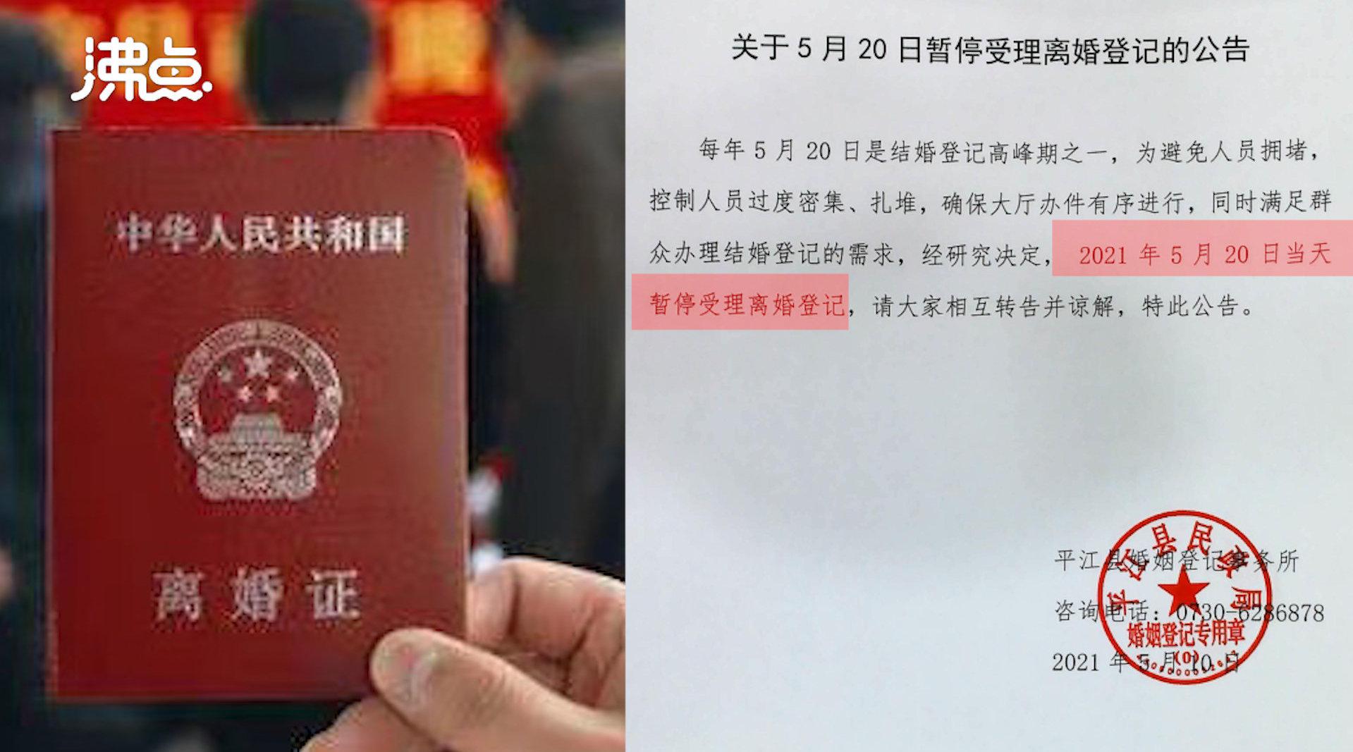 澎湃新闻注意到,5月10日,平江县人民政府官方网站发布“关于5月20日暂停受理离婚登记的公告”。该公告称,每年5月20日是结婚登记高峰之一,为避免人员拥堵,控制人员过度密集、扎堆,确保大厅办件有序进行,同时满足群众办理结婚登记的需求,经研究决定,2021年5月20日当天暂停受理离婚登记,请大家相互转告并谅解,特此公告。