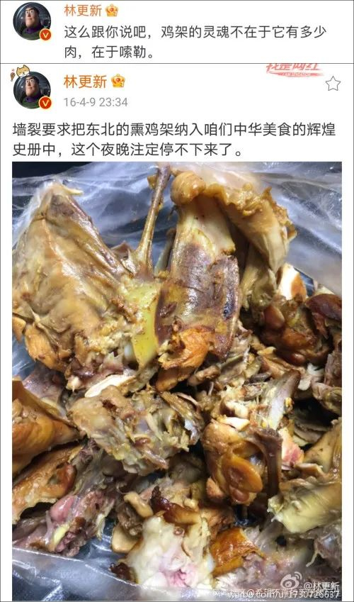 “中华美食沈阳鸡架代言人”林更新,今天也是为鸡架站台的一天:鸡架的灵魂不在于有多少肉,在于“嗦勒”。