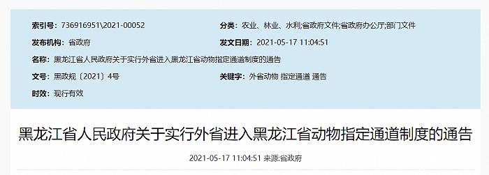 5月17日,黑龙江省人民政府网站发布《黑龙江省人民政府关于实行外省进入黑龙江省动物指定通道制度的通告》。
