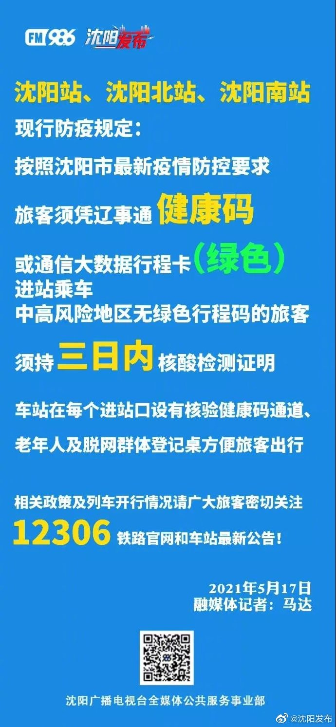 沈阳站、沈阳北站、沈阳南站,旅客须凭辽事通健康码或通信大数据行程卡(绿色)进站乘车,中高风险地区无绿色行程码的旅客须持三日内核酸检测证明。