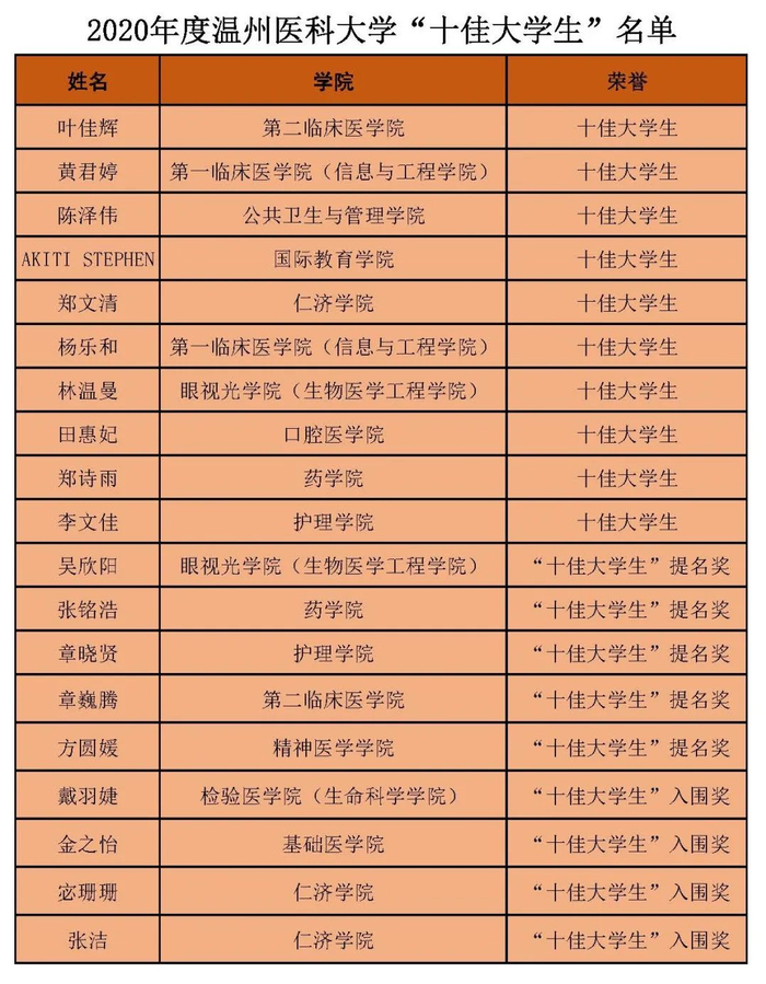 原标题:2020年度温州医科大学“十佳大学生”评选结果揭晓