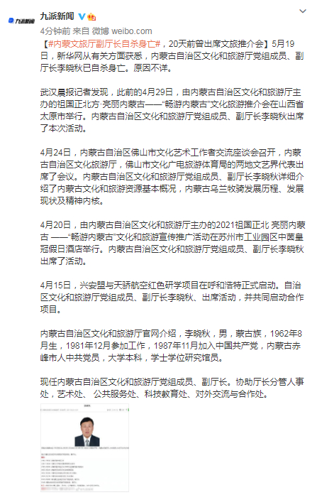 原标题:内蒙文旅厅副厅长自杀身亡,20天前曾出席文旅推介会