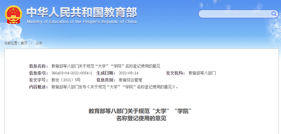 教育部网站2021年5月18日发布八部门《关于规范“大学”“学院”名称登记使用的意见》(下称《意见》),对“大学”、“学院”等名称的登记使用作出规范和要求。