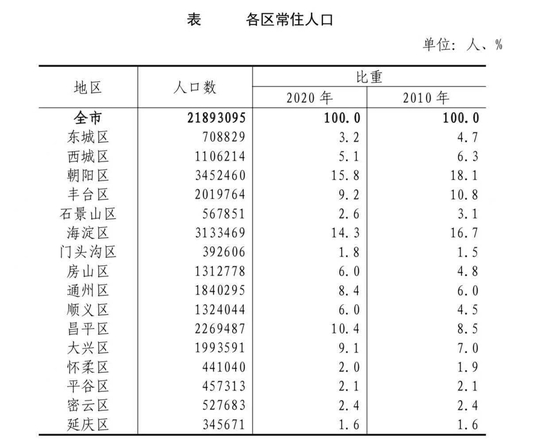 北京这4个区常住人口超200万人