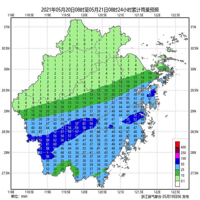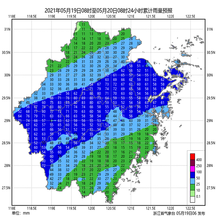 浙北南部、浙中地区和丽水阴有中到大雨,部分暴雨,局地大暴雨;湖州阴有阵雨;其它地区阴有阵雨或雷雨,部分中雨,局部大到暴雨。