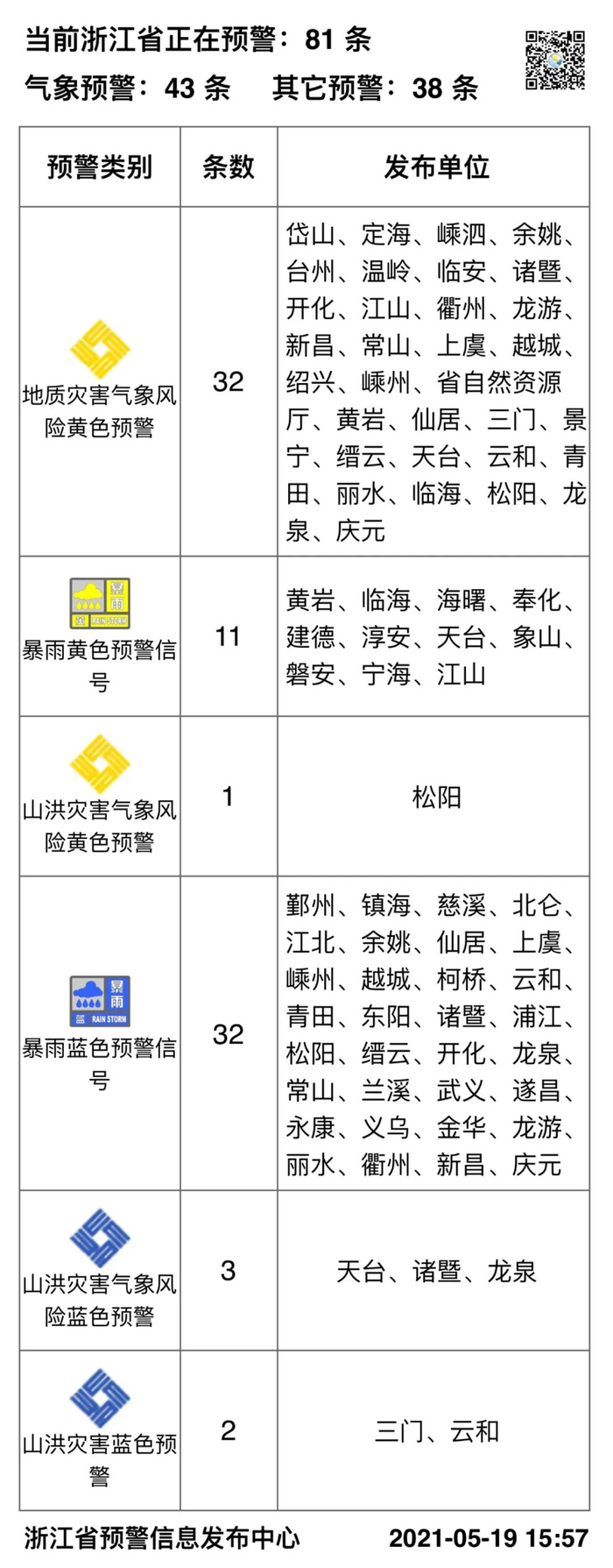降水可能引发山体滑坡、城乡积涝等次生灾害,小伙伴们要注意防范。截至今日16时,浙江已发布81条预警信息:
