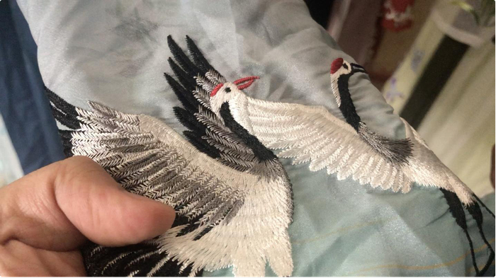 尹啟行的汉服厂房里整齐地摆放着6台绣花机。按下开关,机器针头便自动穿扎在丝绸上,短短几分钟就能绣出各式图案来。这些带着花纹的布料再经过手巧的纺织工以及机器剪裁制作成完整的汉服,最终销往全国各地当中。