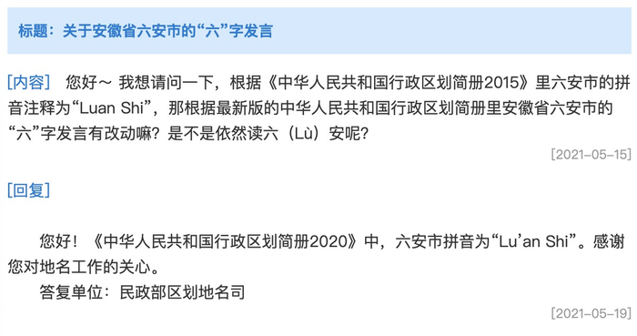 5月15日,有网友在民政部门户网站留言咨询安徽省六安市的“六”字发音问题:“根据《中华人民共和国行政区划简册2015》里六安市的拼音注释为‘Luan Shi’,那根据最新版的中华人民共和国行政区划简册里安徽省六安市的‘六’字发言有改动嘛?是不是依然读六(Lù)安呢?”