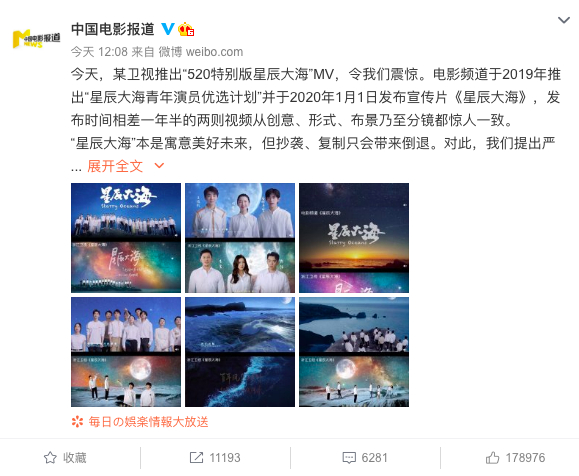 电影频道旗舰栏目官方微博@中国电影报道 20日发文称,今天,某卫视推出“520特别版星辰大海”MV,令我们震惊。电影频道于2019年推出“星辰大海青年演员优选计划”并于2020年1月1日发布宣传片《星辰大海》,发布时间相差一年半的两则视频从创意、形式、布景乃至分镜都惊人一致。