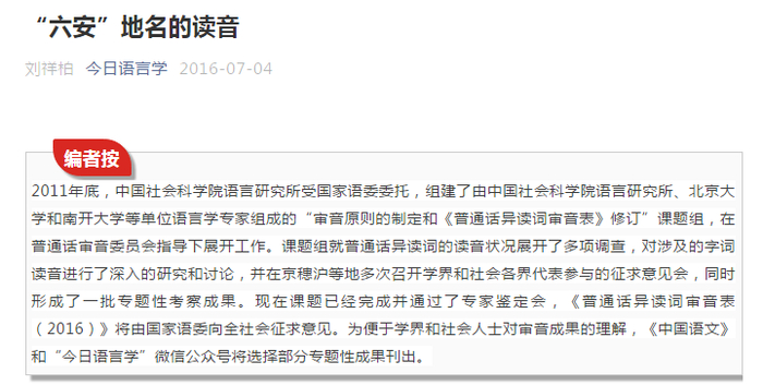 记者了解到,《现代汉语词典》由中国社会科学院语言研究所词典编辑室编纂,目前由其修订的《现代汉语词典》(第7版)也于2016年9月由商务印书馆出版。对于“六安”的读音问题,该所的刘祥柏研究员曾在2016年撰文并解答不再在“两典”收录“六”字已经消失的文读音lù的原因,这也被业内人士视为中国社会科学院语言研究所的官方观点。
