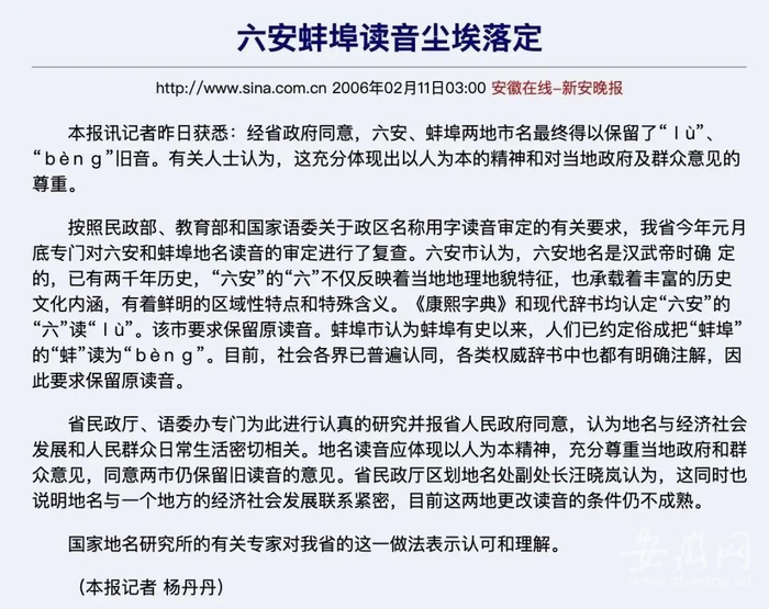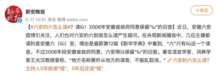 关于六安的读音问题,多年来新安晚报一直在进行关注。今年5月17日《新安晚报》官方微博称:“近日,安徽六安疫情引关注,人们也对六安的六到底怎么读产生疑问。在央视新闻播报中,几位主播都读的是安徽六(liù)安,理由是最新第12版《新华字典》中看到,‘六’只有liù这一个读音。不过2006年经安徽省政府同意,六安得以保留‘lu’的旧音。著名语言学家、词典学家王光汉教授曾称,‘地方名称要听从地方的读音,不能乱取消。’”。