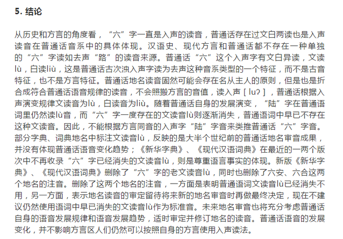 这篇文章在结论部分称:从历史和方言的角度看,“六”字一直是入声的读音,普通话存在过文白两读也是入声读音在普通话音系中的具体体现。汉语史、现代方言和普通话都不存在一种单独的“六”字读如去声“路”的读音来源。普通话六"这个入声字有文白异读,文读lù,白读liù,这是普通话古次浊入声字读为去声这种音系类型的一个特征,而不是古音特征,也不是方言特征。普通话地名读音固然可能会存在名从主人的原则,但是也是折合成符合普通话语音规律的读音,不会照搬方言的音值,读入声[luʔ],普通话根据入声演变规律文读音为lù,白读音为liù。