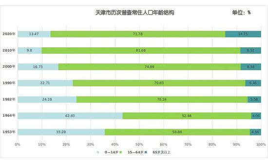 天津市历次普查常住人口年龄结构