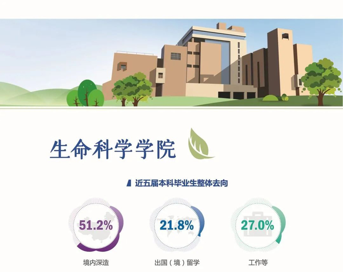 2016-2020届生命科学学院毕业生中,21.8%选择出国(境)留学,51.2%在境内深造,27.0%选择工作等。
